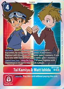 Este Tamer puede darle a Omnimon <Security A. +1>. Esta carta también se recomienda para usar con los efectos de [BT17-102 Greymon] y [BT17-093 Tai Kamiya & Kari Kamiya] que pueden jugar Tamers fácilmente.